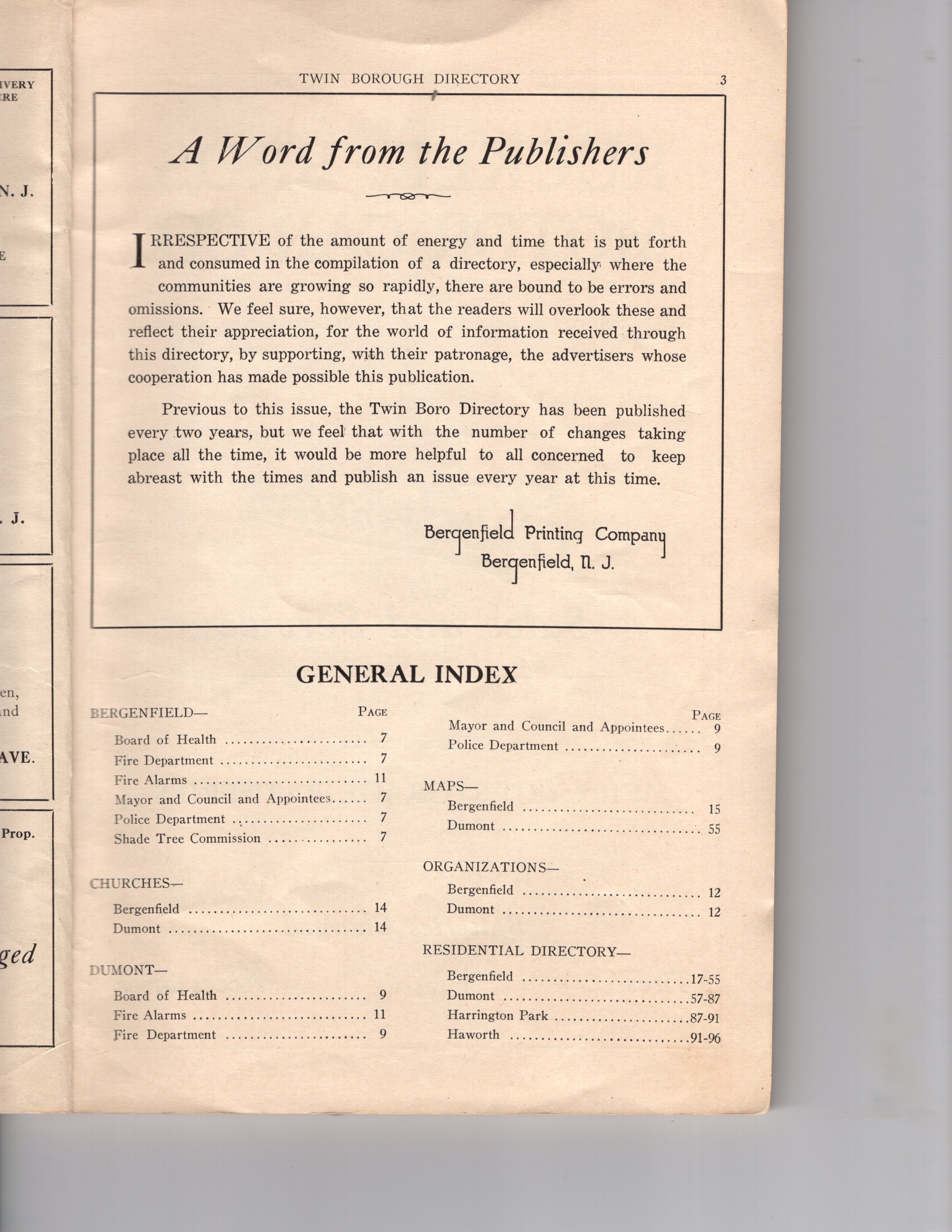 1926 Complete directory of residents of Bergenfield, Dumont, Haworth & Harrington Park, including maps of Bergenfield and Dumont.