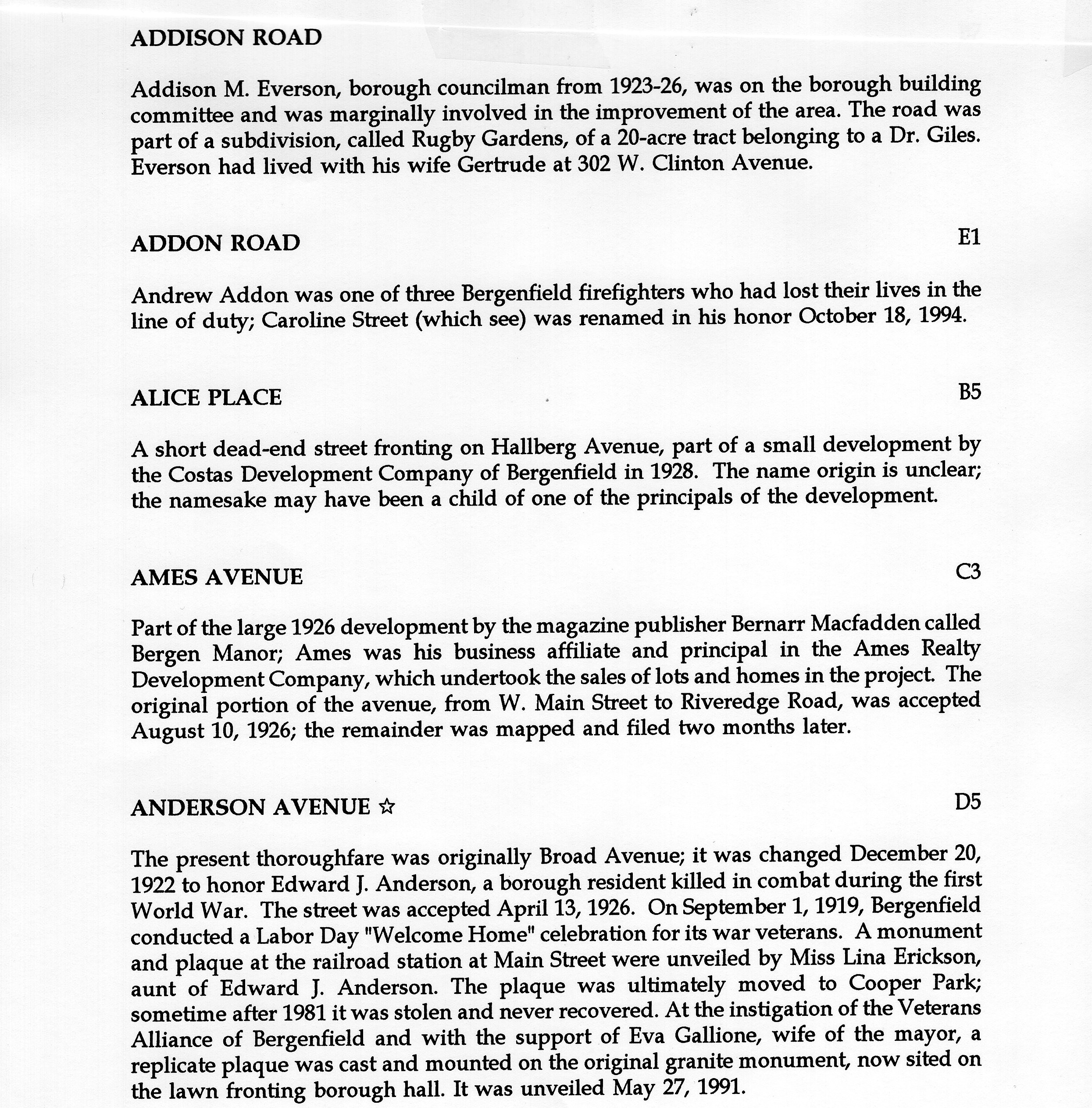 Bergenfield Street Names Page 1